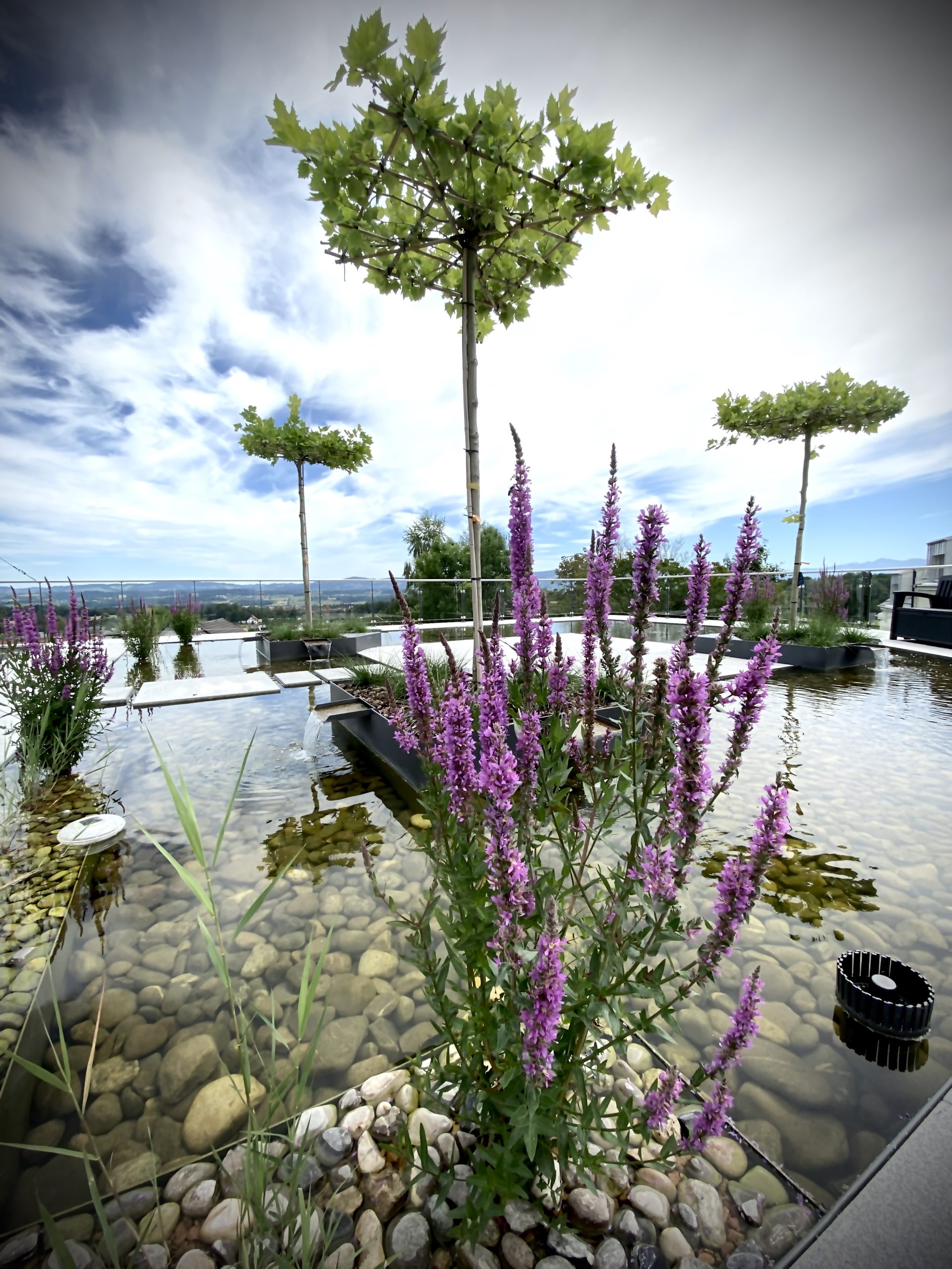 Teichbau mit Pflanzzonen für Wasserpflanzen, Blutweiderich, Schilf, Bauminseln mit Schirmplatanen