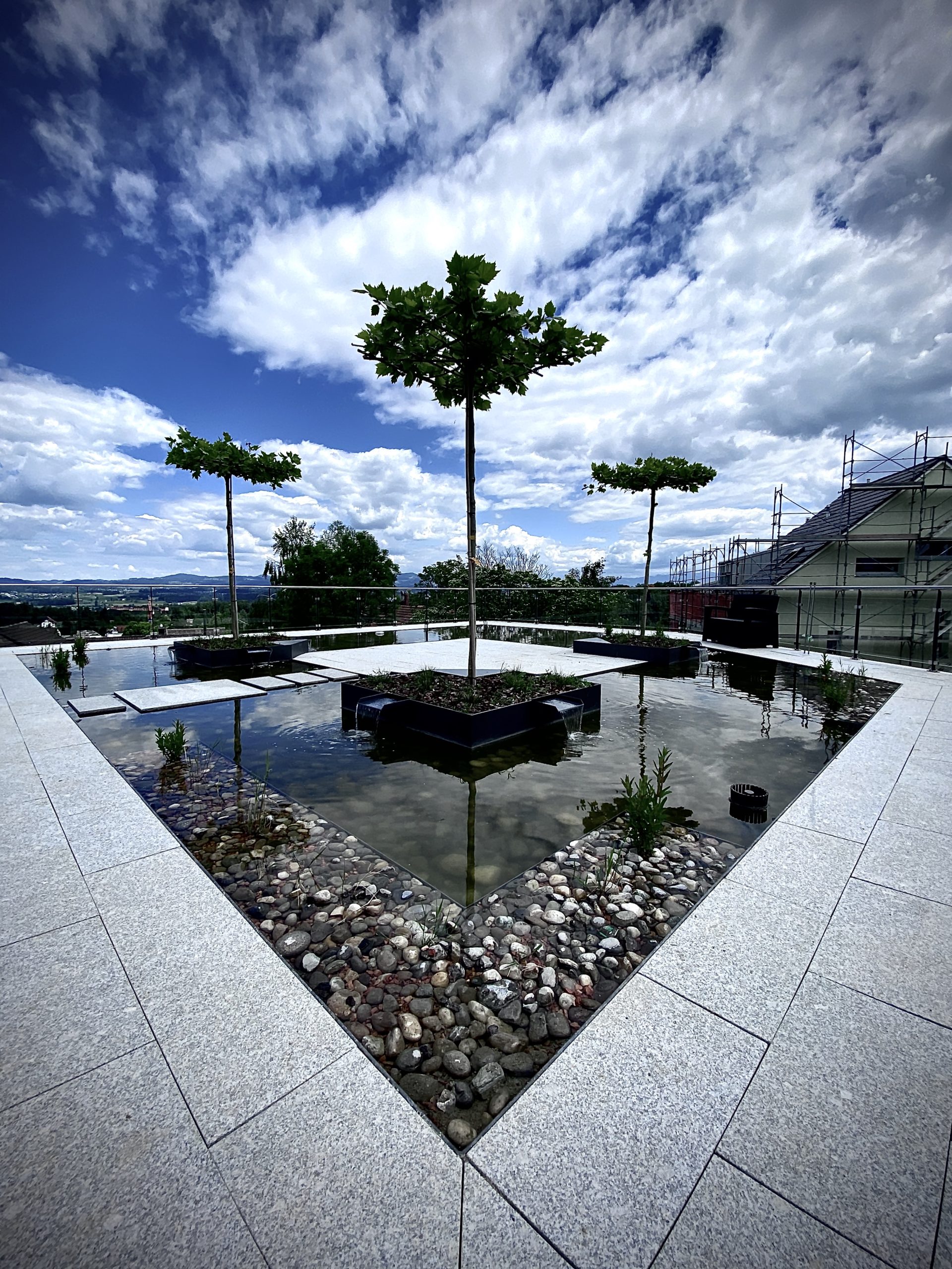 Teichbau auf einem Dach mit Filterzonen, Insel und Baumbepflanzung
